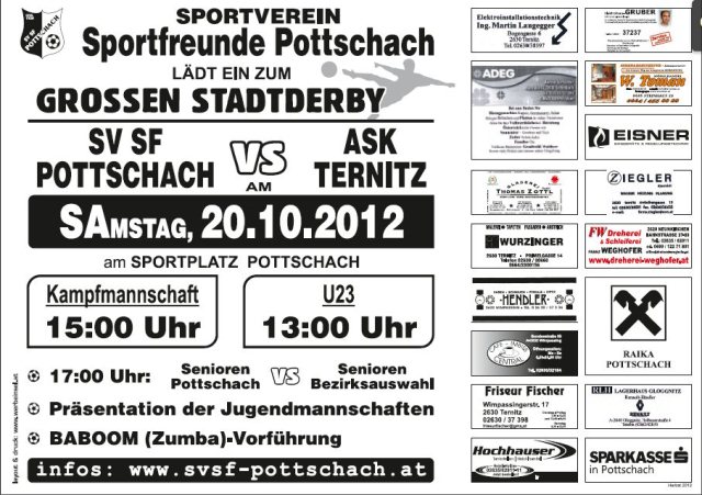 Am Samstag, dem 20. Oktober lädt der SVSF Pottschach zum großen Stadtderby gegen den ASK Ternitz. Nicht nur gesellschaftspolitisch ein absolutes Muss, auch sportlich darf man sich einiges erwarten, spielen ja beide Mannschaften derzeit vorne mit in der 2. Klasse Wechsel. Das Programm steht mittlerweile. Für feinste Unterhaltung ist gesorgt! Neben dem Vorspiel der U23 um 13.00 Uhr und dem Höhepunkt des Spiels der Kampfmannschaften (Anpfiff 15.00 Uhr, der Bürgermeister nimmt den Ankick vor!) gibt es weitere Highlights. Vor dem Spiel der Ersten werden wir Zeuge einer Zumba-Vorführung unter dem Motto “Baboom”, in der Halbzeitpause präsentiert der SVSF alle seine Nachwuchsmannschaften. Schließlich kommt es um 17.00 Uhr als Abschluss zum Duell der SVSF-Senioren mit einer Senioren-Bezirksauswahl. Für Speis und Trank sorgt das Team rund um Margit und Heinz Teichmeister. Der bisherige Zuschauerrekord bei Stadtderbys liegt bei 600, bei gutem Wetter sollte diese Marke sicher zu knacken sein! Also, am 20.10. alles auf in die SVSF-Arena!
