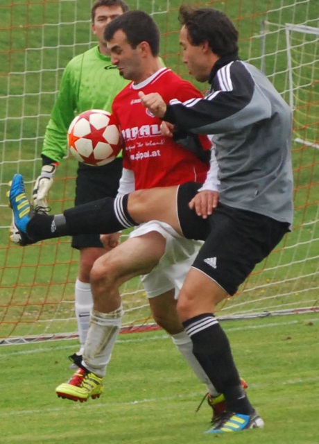 Zur Pause kochten die Gemüter etwas auf: Schiri Habernig hatte nicht nur das angebliche Handspiel beim Anschlusstreffer übersehen (vielleicht war es auch der dichte Nebel, der zwischen 31. Minute und Halbzeit durchs Stadion zog), er hatte auch Slobo Mazic die gelbe Karte gezeigt, weil er den Ball 30 cm vor der Outlinie (was ja laut Regelbuch erlaubt ist) runter Richtung Steiermark schoss. Habernig leistete sich noch etliche weitere Fehlpfiffe. Dazu später mehr.