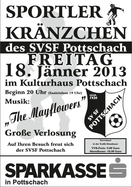 Das erste Highlight des Jahres 2013 steigt am Freitag, dem 18. Jänner. Der SVSF lädt erstmals an einem Freitag zum traditionellen Sportlerkränzchen ins Kulturhaus Pottschach. Beginn der Veranstaltung ist um 20.00 Uhr (Einlass bereits um 19.00 Uhr). Auch heuer sorgen wieder die “Mayflowers” rund um Ex-SVSF-Kicker Franz Grill für die musikalische Unterhaltung. Überragend wird auch heuer wieder die große Tombolaverlosung sein. Karten im Vorverkauf (9 Euro, Abendkasse 10 Euro) gibt es in der Trafik Klambauer und beim Vorstand…