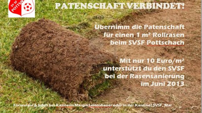Die große Aktion “Übernimm die Patenschaft für einen Quadratmeter Rollrasen” ist zu Ende, und die Bilanz ist eine überragende. 255 Quadratmeter wurden von zahlreichen “Paten” gespendet, die Rasensanierungsaktion ist mittlerweile über die Bühne gegangen. Die angelegten Rasenziegel wachsen seit einer Woche an. Der Vorstand ist überwältigt von der Hilfsbereitschaft des SVSF-Volks. Zu Beginn der Saison wird vor der Kantine eine Tafel mit allen “Paten” hängen.An dieser Stelle ein großes DANKESCHÖN für jeden einzelnen Quadratmeter, der gespendet wurde…