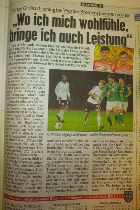 Unsere drei Profis kamen am vergangenen Wochenende nicht zum Einsatz. Lukas Spendlhofer und Philipp Koglbauer saßen auf der Bank, Florian Grillitsch war verletzt. Dennoch war Flo diese Woche präsent, denn am Montag tauchte ein großer Artikel in der Kronenzeitung auf (siehe Bild).