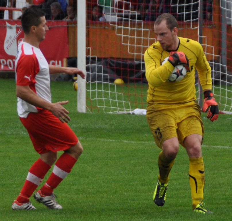 Von der ersten Minute an übernahm der SVSF das Kommando. Schottwien konzentrierte sich zunächst darauf, hinten sicher zu stehen. Das gelang nur bedingt, denn Pottschach zog gleich das Tempo an und erarbeitete sich ein klares Übergewicht. In der 9. Minute erwischte Marvin Wellisch (für den erkrankten Kevin Senft in der Startelf) eine Flanke von Slobodan Mazic per Kopf nicht richtig. Dass sich auch die Schottwiener nicht verstecken wollten, bewies sich in der 13. Minute. Den Dropkick von Novotny drehte SVSF-Schlussmann Dominik Peinsipp mit einer schönen Parade über das Tor. Dann wieder Pottschach! Einen Kopfball von Zoki Radulovic parierte Gästegoalie Faustbeck (16.), einen Weitschuss von Meni Marku drehte er in den Corner (21.). Aus dem Eckball sollte das Pottschacher Führungstor fallen!
