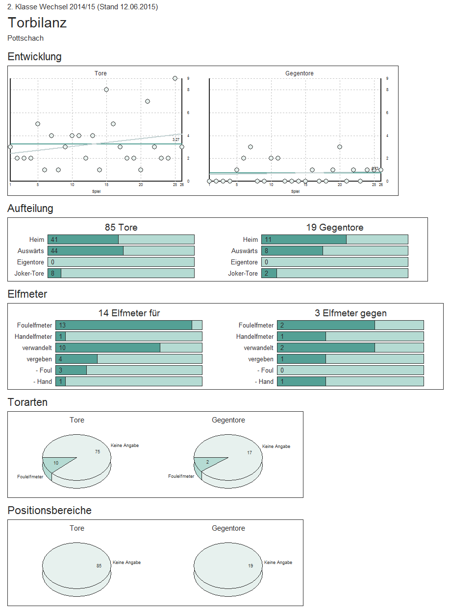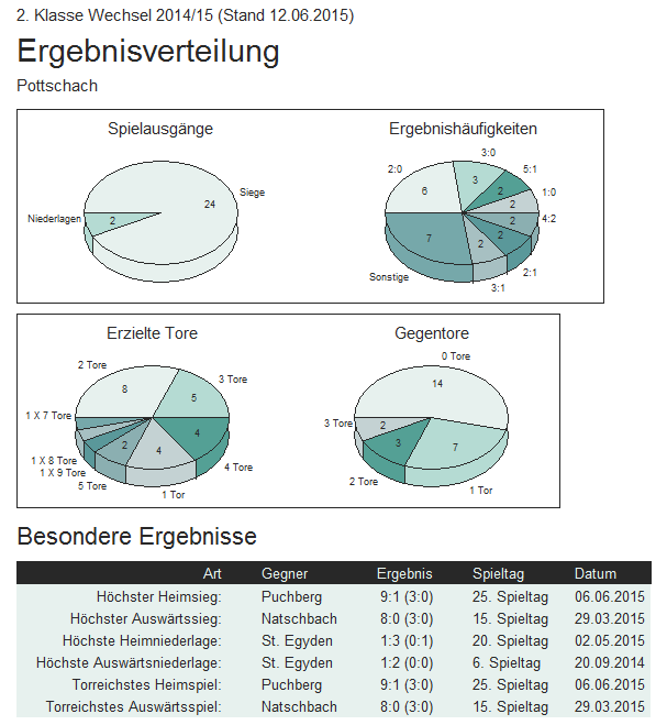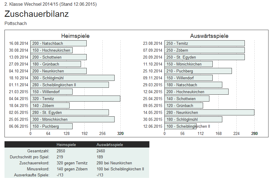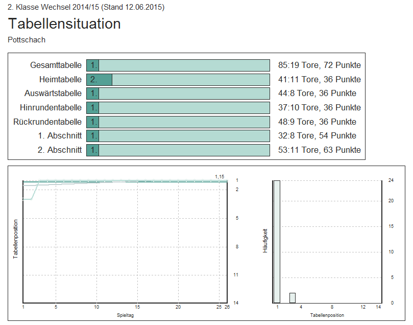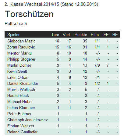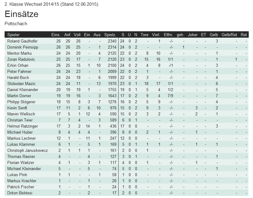 Besser hätte das Frühjahr 2015 gar nicht verlaufen können: Der SVSF Pottschach verteidigte seinen Punktepolster nicht nur, nein. Er baute seinen Vorsprung sogar noch aus. 15 Punkte hatte man am Ende mehr als der erste Verfolger St. Egyden, den Vereinsrekord (17 Punkte Vorsprung aus 1997/98) verpasste man nur knapp. Andere Rekorde konnten im Laufe der Saison aber aufgestellt werden, die da wären: 13 Siege in Serie gab´s noch nie in der Vereinsgeschichte. Auch 13 Heimsiege in Folge wurden noch nie geschafft. Zehn Auswärtssiege in Serie konnte ebenfalls noch nie eine Pottschacher Mannschaft realisieren. 24 Siege in einer Saison bedeuten ebenfalls einen neuen Bestwert, wie die lediglich 19 kassierten Gegentreffer. Dazu blieb man 14 Mal ohne Gegentor, was auch unerreicht ist.