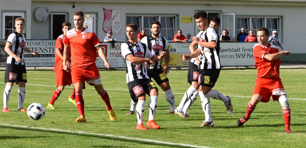 Mit einem 3:1-Erfolg über Sollenau glückte dem SVSF ein Auftakt nach Maß in der neuen Saison. 220 Zuschauer waren bei tollem Wetter in Bine´s SVSF-Arena gekommen. Wer zu spät kam, verpasste einiges, denn die Bock-Truppe stellte die Zeichen schon früh auf Sieg. Mit Martin Dorners frühem Treffer (2.) ließ es sich leichter spielen. Sollenau schüttelte den Gegentreffer bald ab und zeigte, dass sie eine gute und spielstarke Truppe haben. Offensive Durchschlagskraft fehlte den Gästen aber, dazu standen sie in der Abwehr sehr sehr hoch, was die schnellen Pottschacher Angreifer immer wieder nutzen konnten. Mehrere Topchancen konnten aber nicht genutzt werden (23., Filipsky, 27. Stögerer, 28. Senft). Das zweite Tor war längst fällig und fiel auch zehn Minuten vor der Pause. Dali Dervisevic verwandelte einen Elfmeter zur 2:0-Pausenführung.