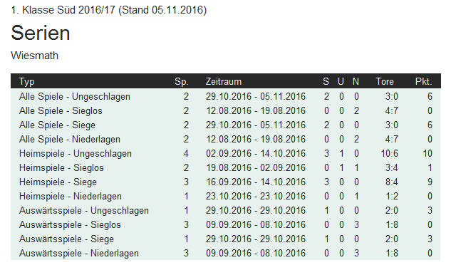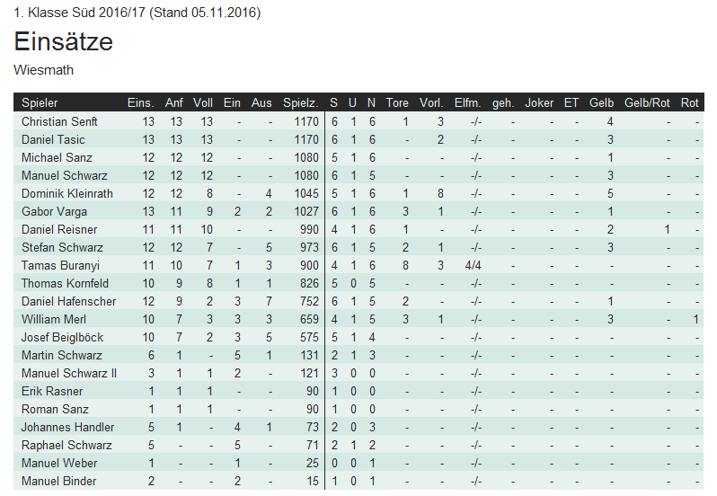Obwohl die Wiesmather die letzte Saison als Vizemeister beendeten, passten die Ergebnisse am Ende nicht mehr so. Den negativen Elan nahm man auch in die neue Saison mit. Nach zwei Spielen standen null Punkte auf dem Konto. Erst mit einem 2:1-Sieg in Pottschach punkteten die Eidler-Schützlinge erstmals. In der Folge entwickelte sich die Saison zu einem stetigen Auf und Ab, an dessen Ende man mit jeweils sechs Siegen und sechs Niederlagen eine durchschnittliche Bilanz aufwies. Dabei musste man sich mehrmals ob vergebener Chancen ärgern: Immerhin führte man gegen Ebreichsdorf schon mit 2:0, bitter fiel auch die Nachspielzeit gegen Grimmenstein aus, als aus einem 1:0 noch ein 1:2 wurde. Mit zwei Siegen am Ende brachte man die Hinrunde mehr als ordentlich hinter sich. Die Wiesmather gelten allgemein bekannt als Rückrundenspezialisten: Auch letzte Saison startete man im Frühjahr eine Aufholjagd. Mal sehen, ob ihnen dieses Kunststück 2017 erneut gelingt…