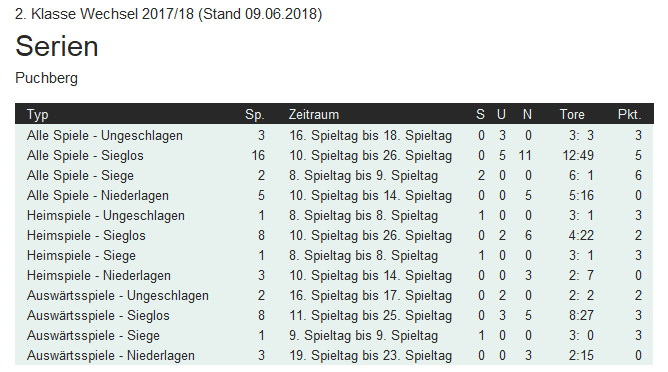 Schon der Herbst war nicht das Gelbe vom Ei, im Frühjahr sollte der ATSV Puchberg noch stärker abfallen. Dabei war der Start in die Rückrunde gar nicht so schlecht. In den ersten drei Partien holte man ebenso viele 1:1-Unentschieden gegen Natschbach, Willendorf und Schlöglmühl. Weil man die letzten vier Hinrundenspiele verloren hatte, entwickelte sich eine Sieglosserie, die bis zum Ende der Saison im Juni anhalten sollte. Das 0:8-Debakel in Neunkirchen läutete vier Niederlagen in Serie ein. Unterbrochen wurde die Serie nur durch ein torloses Remis im Heimderby. In den letzten vier Partien überraschte Puchberg (Thomas Steiner hatte interimistisch als Trainer übernommen) einmal noch am vorletzten Spieltag in St. Egyden, sonst setzte es klare Niederlagen gegen Howodo, Pottschach und bei der Meisterentscheidung gegen Zöbern. Puchberg war nicht nur schwächstes Heimteam der Liga, sondern auch das schwächste Rückrundenteam. Mittlerweile ist der ATSV seit 16 Spielen ohne Sieg.