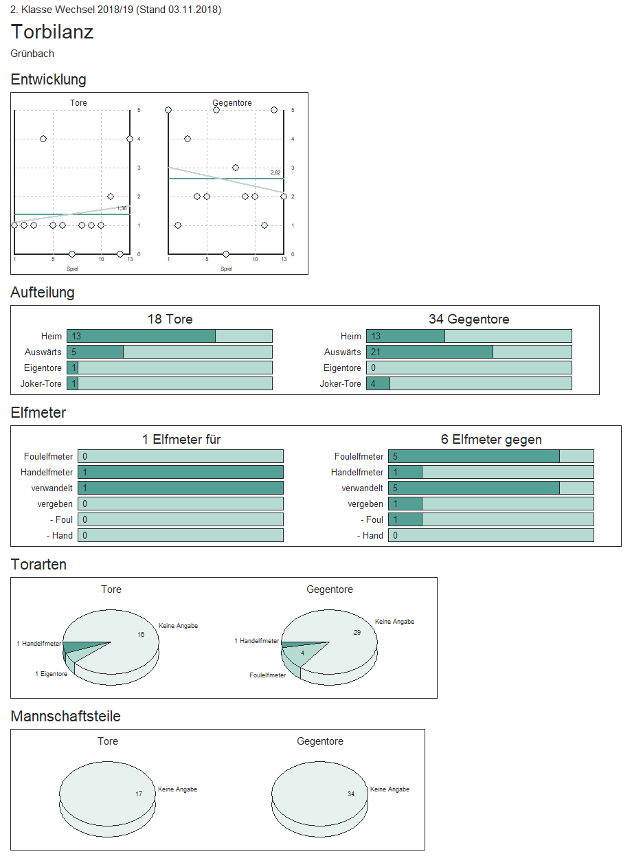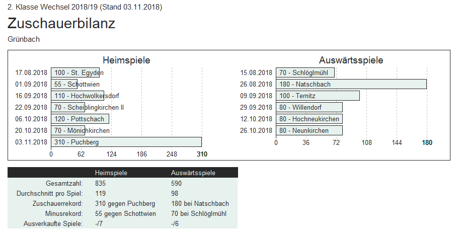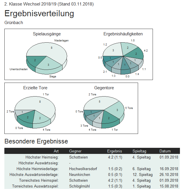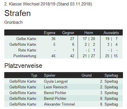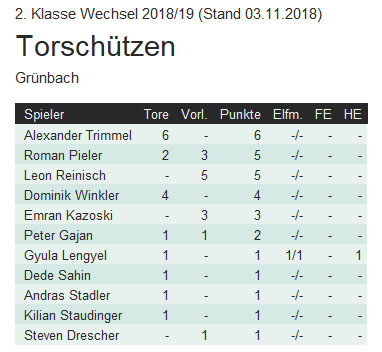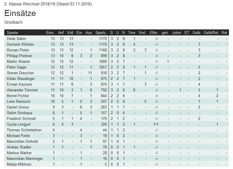Für die Grünbacher reichte es zum Ende der Hinrunde nur zum 13. und vorletzten Platz. Vor allem die Auswärtsschwäche war zu guter Letzt entscheidend, warum nicht mehr möglich war. Der SVG war schon vor Beginn der Saison 12 Auswärtspartien sieglos, die Misere sollte sich dann auch im Herbst fortsetzen. Schon zum Auftakt ließ man sich von Schlöglmühl-Goalgetter Nedeljkovic vier Stück einschenken. Zumindest ein Tor schoss man auch in Natschbach, Ternitz, Willendorf und Hochneukirchen, was aber trotzdem zu wenig war. Bei sämtlichen Niederlagen wäre bei günstigem Spielverlauf und ein wenig mehr Konsequenz vor dem gegnerischen Tor mehr drin gewesen. Im letzten Auswärtsspiel kassierte man in Neunkirchen in den letzten 20 Minuten vier Gegentore. Die Auswärtsmisere damit abgehakt. Wenigstens lief es in den Heimspielen durchwegs mehr als ordentlich. Nur gegen Howodo war man chancenlos, gegen Pottschach verlor man nur knapp, ansonsten verkaufte man sich vor allem gegen die Topteams der Liga ausgezeichnet. St. Egyden und Scheiblingkirchen konnte mit Kampf und Leidenschaft ein Unentschieden abgerungen werden. Gegen Mönichkirchen landete man einen überraschenden Heimsieg. Der erste Dreier der Saison wurde gegen Schottwien errungen, der letzte (erneut 4:2) im Derby gegen Puchberg vor großer Zuschauerkulisse. Mit 18 Toren erzielte man die zweitwenigsten, auch weil die ungarischen Legionäre Andras Stadler (zu Saisonbeginn verletzt) und Gyula Lengyel (ab Mitte der Saison nicht mehr dabei) zu streichen waren. Hinten zeigte Goalie Martin Skarek einmal mehr, dass er einer der besten Schlussmänner der Liga ist. Der Derbysieg zum Saisonende ließ den Vorsprung auf die Rote Laterne auf fünf Punkte anwachsen, der Kontakt zum hinteren Tabellenmittelfeld ist halbwegs hergestellt. Sollen es im Frühjahr mehr als elf Punkte werden, wird man auch den Auswärtskomplex (letzter Sieg im Juni 2017) endlich wieder ablegen müssen.