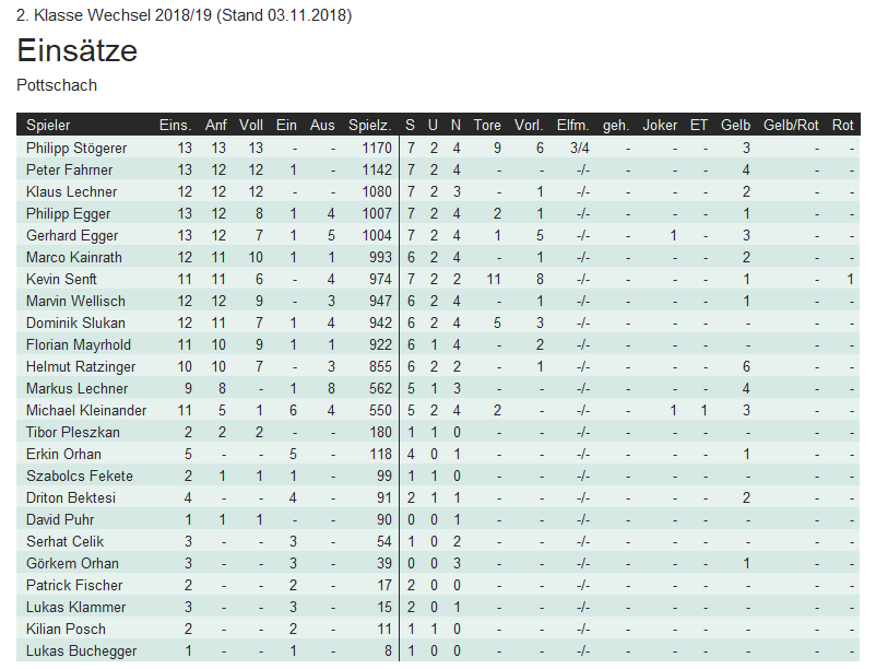13 Mann hoch war der Stamm, mit dem Trainer Manuel Mannsfeldner in fittem Zustand arbeiten konnte. Dazu erarbeitete sich der eine oder andere Junge mit guten Leistungen in der U23 Einsätze in der KM. Wichtigster Akteur in der Hinrunde war sicherlich Kevin Senft, der mit 11 Toren und 8 Assists (in elf Spielen) nur schwer zu halten war. In der Offensive leistete Philipp Stögerer mit neun Toren und sechs Assists einen wertvollen Beitrag. Der Shooting-Star der Hinrunde war sicherlich Dominik Slukan, der das Upgrade von der U17 in die KM problemlos in die Tat umsetzte und mehrere Talentproben ablieferte (5 Tore, 3 Assists). Am anderen Ende der Erfahrungsskala war Peter Fahrner ein verlässlicher Baustein in der Abwehr, Marvin Wellisch meldete sich nach langer Verletzungspause mit guten Leistungen in der Viererkette zurück. Nach überstandenen Verletzungen erkämpften sich auch Marco Kainrath und Florian Mayrhold wertvolle Stammplätze. Der sportliche Leiter Klaus Lechner hielt auch als “Handschuh” die Fäden beziehungsweise Bälle fest in der Hand. Die beiden Egger-Brothers Gerhard und Philipp sorgten im Pottschacher Mittelfeld für Recht und Ordnung. Der ansonsten zu handzahme Helmut Ratzinger war mit sechs gelben Karten in zehn Einsätzen einer der “Bad Boys” der Liga. Zu guter Letzt ließen sich auch die Außenverteidiger Messi Lechner (von einem Bänderiss im Knöchel) und Michi Kleinander (erzielte beim 5:1 gegen Hochneukirchen einen der schönsten Treffer der Hinrunde) nicht stoppen. Schnell Geschichte waren die beiden ungarischen Legionäre Tibor Pleszkan (eigentlich schade um ihn, wäre sehr wertvoll gewesen) und Szabolcs Fekete (war nur im letzten Frühjahr eine Verstärkung). Auch Comebacker Erkin Orhan trat die Winterpause früher an, um sich für das kommende Frühjahr wieder in Form bringen zu können. Toni Bektesi erwies sich als wichtiger Standby-Verteidiger. Serhat Celik, David Puhr, Pazi Fischer und Lük Klammer von den “älteren Jungen” verdienten sich Kurzeinsätze. Dazu verhalf Coach Mannsi auch den “Rookies” Görkem Orhan, Kilian Posch und Lukas Buchegger zu deren Debüts in der KM. Eine Tatsache, die die SVSF-Familie stolz machen kann: KM und U23 bestehen ausschließlich aus Eigenbauspielern. Der SVSF Pottschach geht als Vorzeigeverein ins 99. Jahr seines Bestehens…
