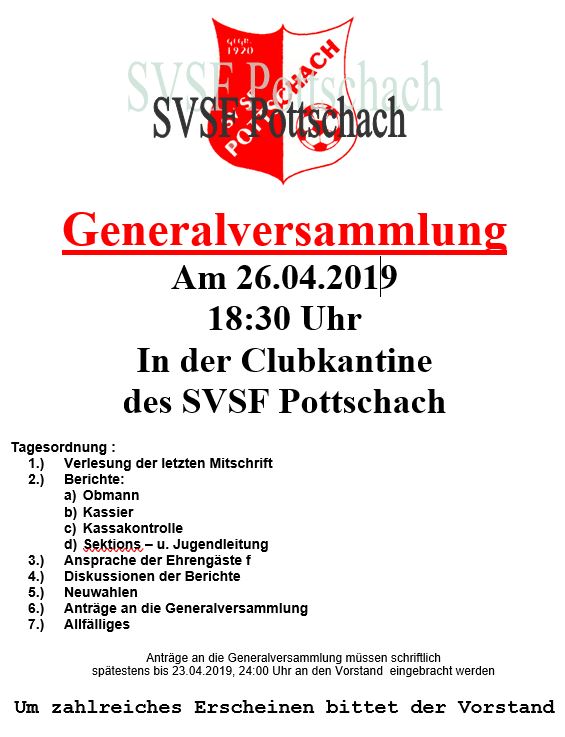 Der SVSF lädt alle Mitglieder zur GV am Freitag, den 26. April 2019 (in der Kantine) ein. Beginn ist um 18.30 Uhr! Die Tagesordnungspunkte finden Sie auf dem Plakat (siehe unten)…