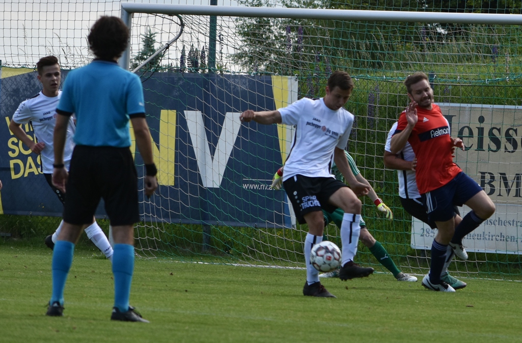 Gegenüber dem Howodo-Spiel kehrten Helmut Ratzinger, Michi Kleinander und Philipp Stögerer wieder in die Formation zurück, dafür musste 20 Tore-Mann Kevin Senft wegen seines neuen Jobs passen. Fehlten also nur mehr (immer noch) Wellisch, M. Lechner, G. Egger, P. Egger und Kainrath. Der SVSF mit breiter Brust, und dick unterstrichen wurde das nach bereits 25 Sekunden: Philipp Stögerer lässt am Sechzehner kurz prallen, Dominik Slukan legt sich das Leder einmal vor und trifft dann herrlich ins lange Eck (1.). Tolles Tor, die Führung hielt aber keine fünf Minuten. Diesmal Ecke für die Hochneukirchner, am kurzen Eck steigt Kapcsos hoch und köpft ein. 1:1 nach fünf Minuten! In der Folge entwickelte sich eine ausgeglichene Partie, in der Pottschach ein klares Chancenplus verbuchen konnte. Zuerst hatte Pottschach noch Glück, als Genczler bei einer Bogenlampe höher als SVSF-Keeper David Puhr stieg, der Kopfball aber knapp daneben ging (16.). Dann aber nur mehr der SVSF: Nach einem Konter schoss Florian Mayrhold drüber (20.), dann setzte sich Domi Slukan an der Cornerlinie durch, dessen Stanglpass schoss Philipp Stögerer aus guter Position in die Wolken (27.). Dann ein Solo von Dominik Slukan, der letzten Endes verzog (34.). Und die größte Chance vergab Flo Mayrhold, der nach idealem Pass von Philipp Stögerer allein vorm herauslaufenden Goalie Doppler den Keeper aber auch das Tor überhob (36.). Das 2:1 war fällig, und fiel auch fünf Minuten vor dem Pausenpfiff: Schiri Milinkovic fing einen Pass der Heimischen ab (kein Schmäh), Florian Mayrhold ging rechts ab, die halbhohe Hereingabe verwertete Helmut Ratzinger volley ins kurze Eck. Die Pausenführung verdient!